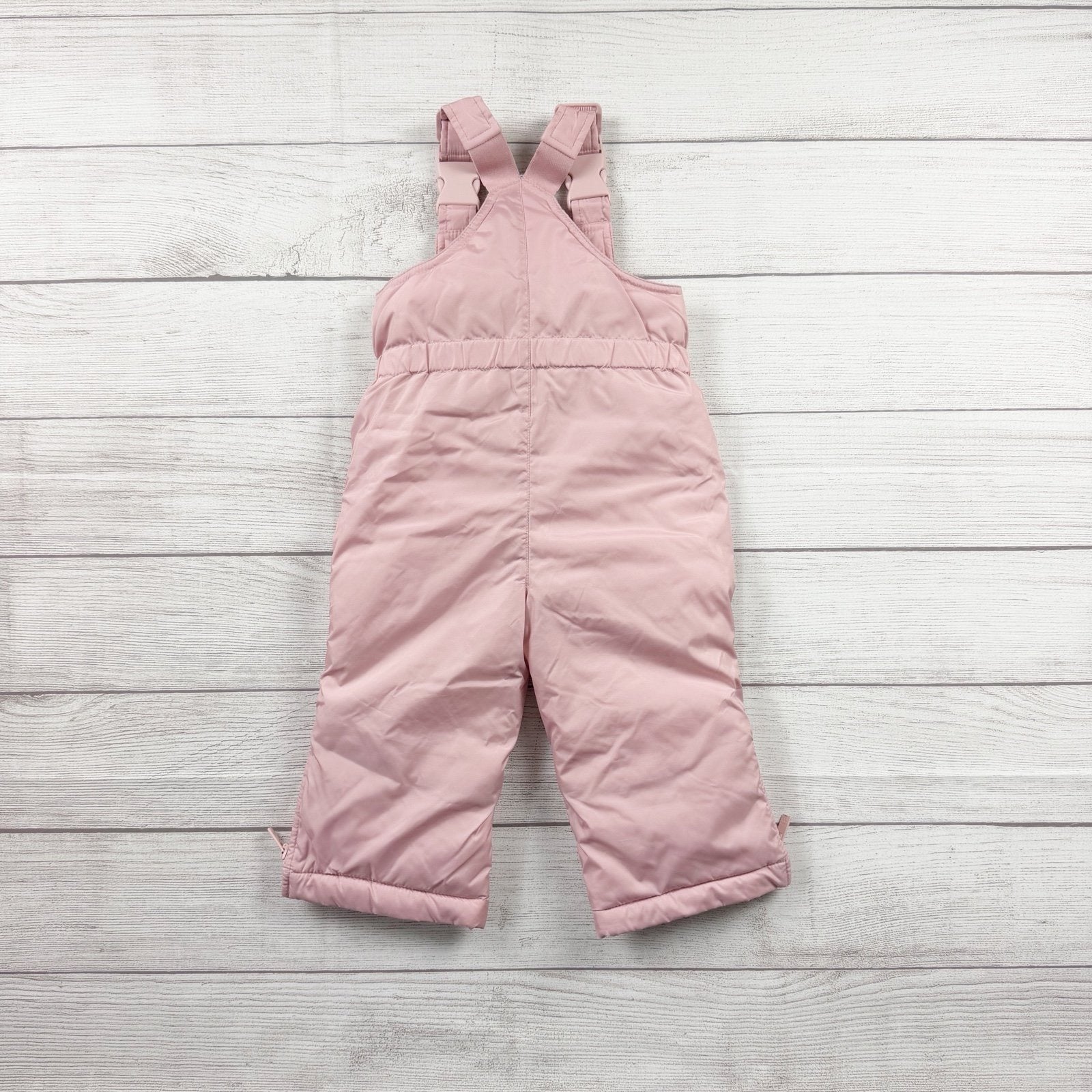 Solid pink snowbib snow bibs snow pants. Adjustable straps. Zip chest. Cuffed inner legs. Zip on side of legs