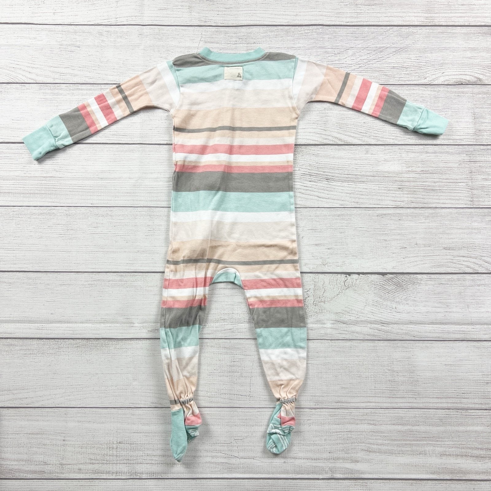 Colorful stripe long sleeve one piece zip up footed sleep and play pajamas. Organic cotton.