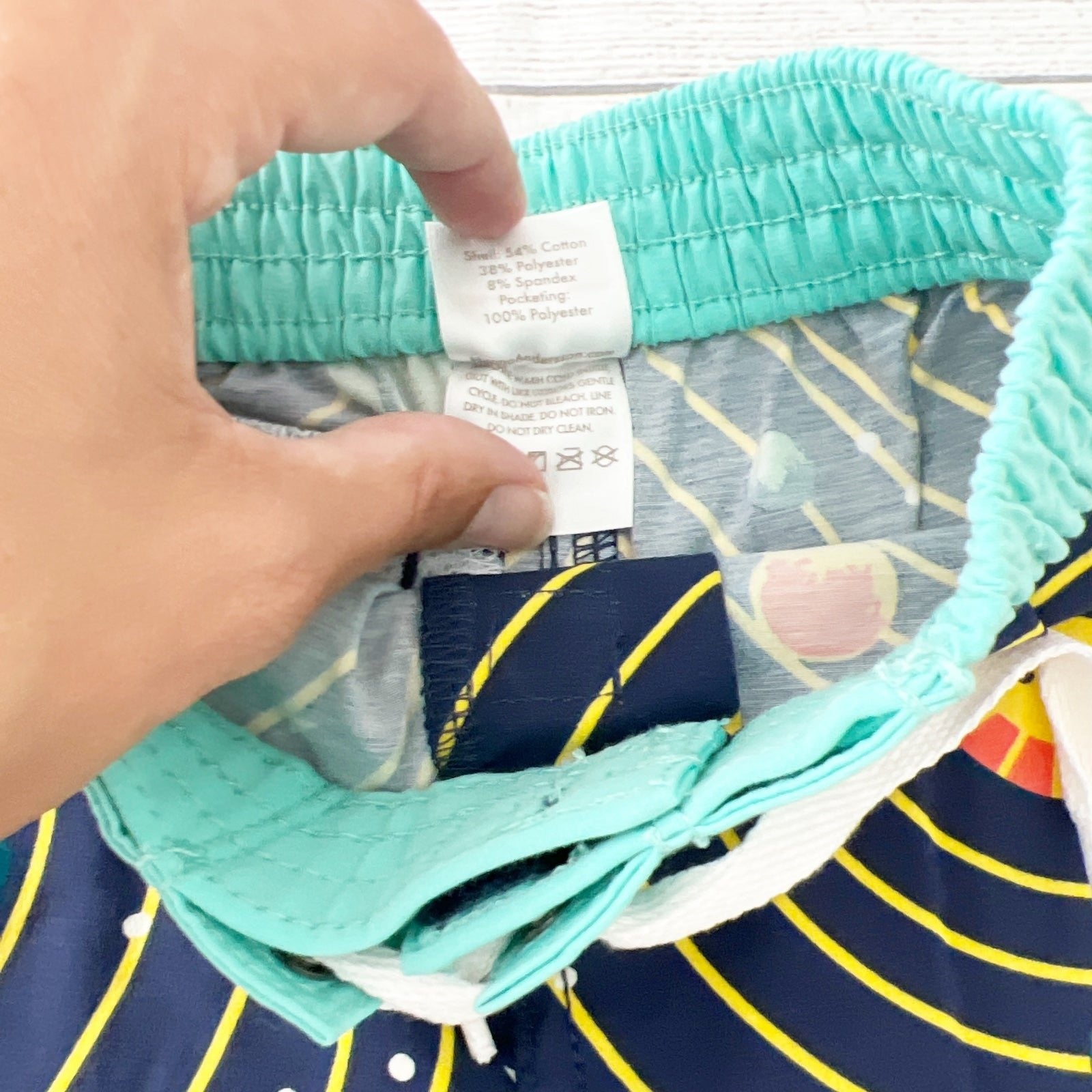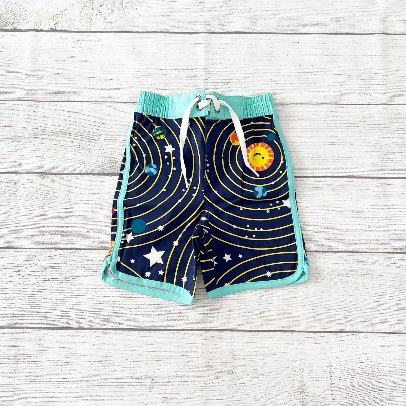 Blue and teal board shorts swim trunks with white lace drawstring. Print includes planets and space. No liner within