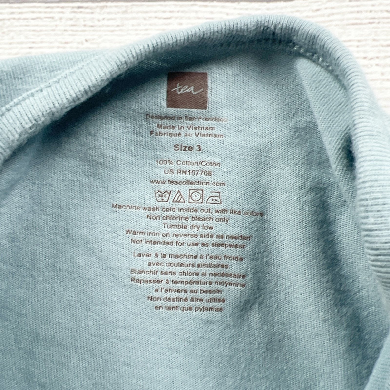 Tea Collection toddler girls long sleeve dress in size 3 featuring a soft light blue top with a cute keyhole neckline and a tiered ruffle skirt in a dark blue floral print. Comfortable fit-and-flare style with double ruffle layers for extra twirl. Made from 100% cotton—perfect for school, playdates, and dressing up in cooler weather. Gently used in great condition.