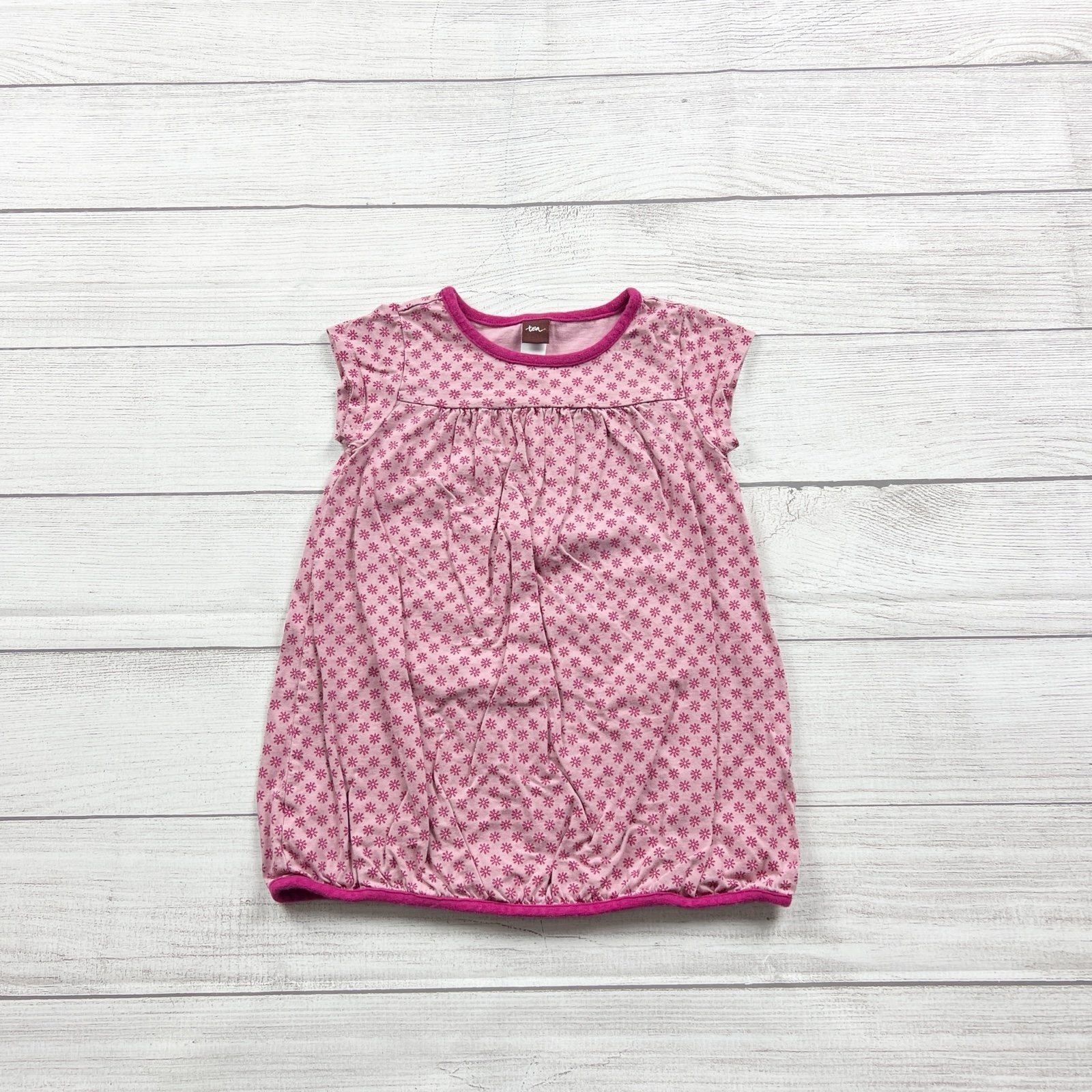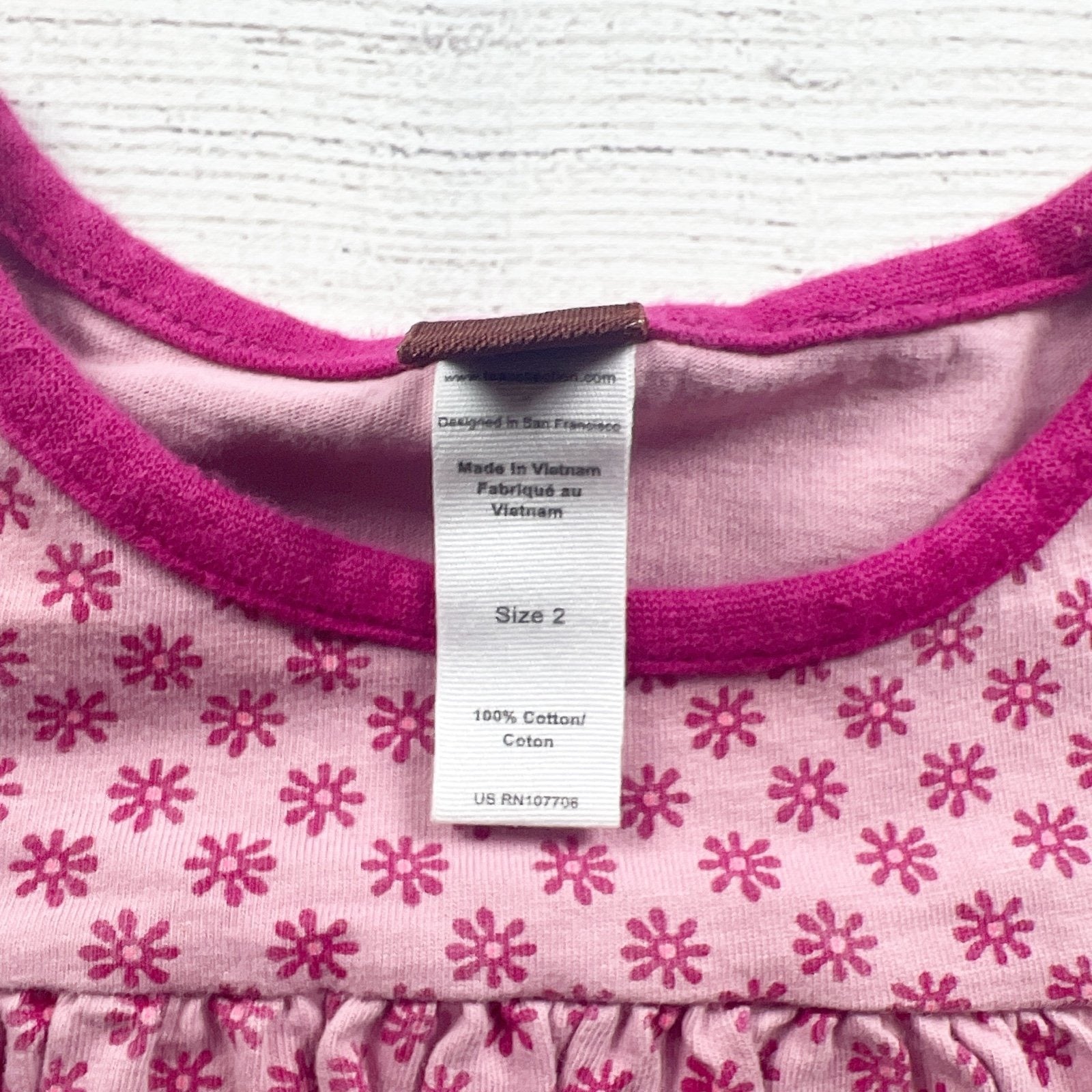 Tea Collection toddler girls dress in size 2 featuring a soft pink color with an allover small floral/starburst print and bright magenta trim. Cute cap sleeves with a gathered yoke and a bubble hem for a comfortable, playful fit. Made from 100% cotton—perfect for warm weather, playdates, and everyday outfits. Gently used in great condition.