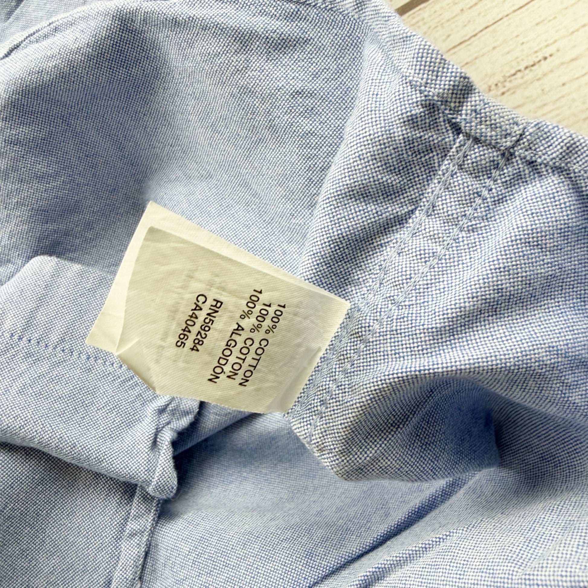Details: long sleeve button-down shirt, collared neckline, front button closure, chest pocket, lightweight woven cotton, easy dress-up style, gently used