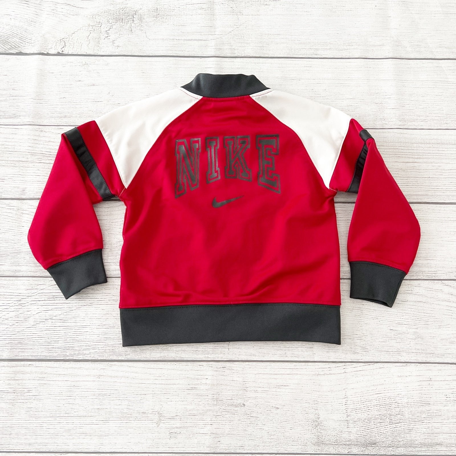 Red white and grey gray zip up track jacket. Large logo on back