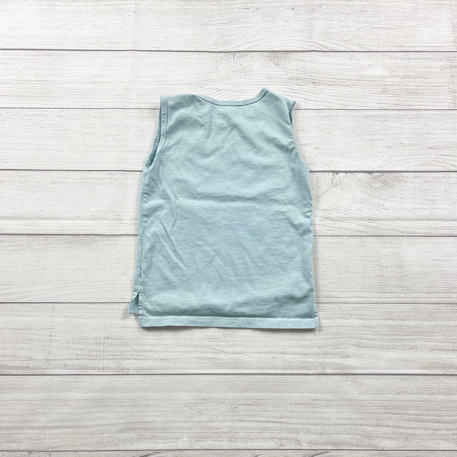 Trilogy Design Co kids sleeveless tank top in size 5T. Light blue muscle tee style with bold white text graphic that reads “LET THE OCEAN WORRY ABOUT BEING BLUE.” Soft 100% cotton for breathable comfort. Great for summer, beach days, or layering. Gently used condition.