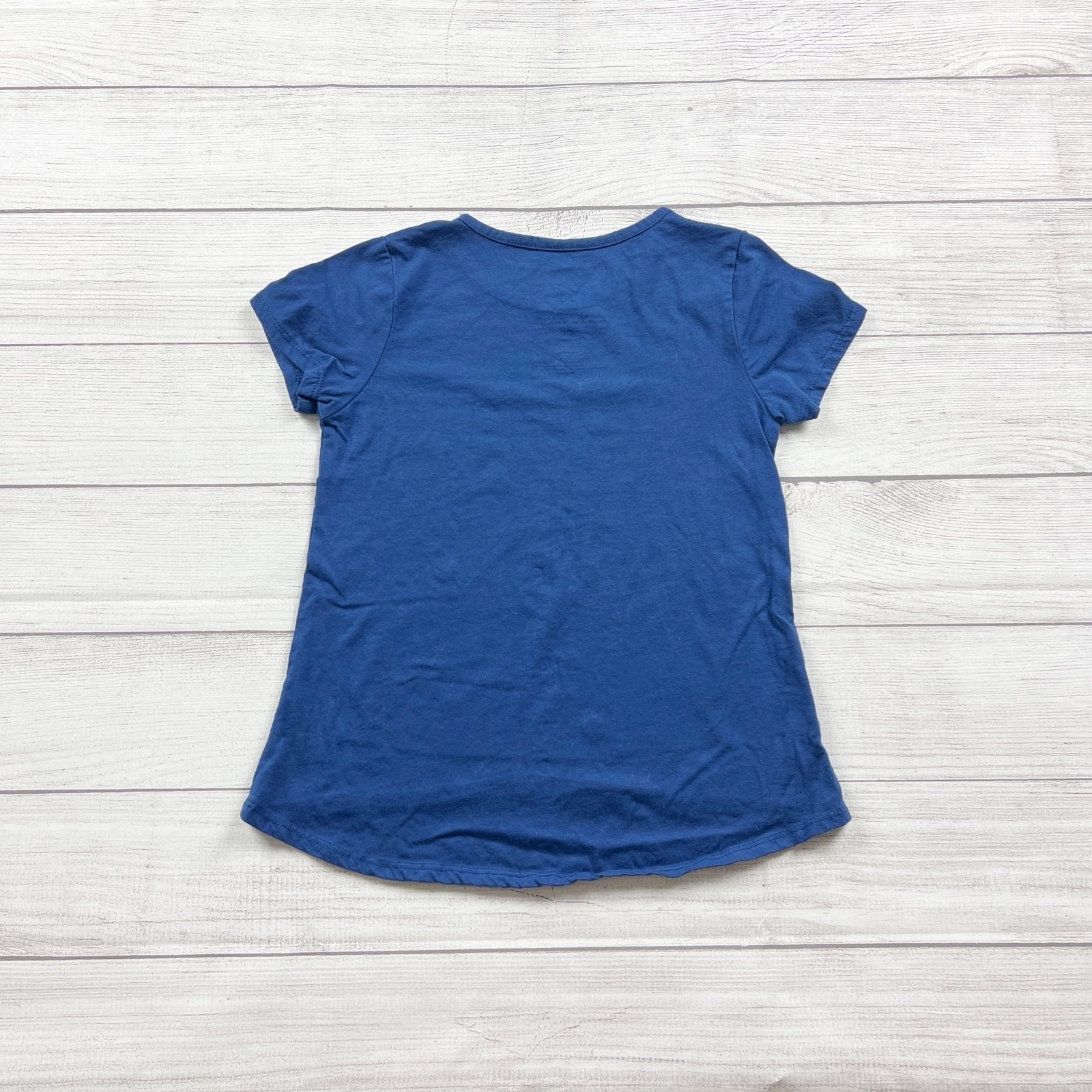 Wonder Woman girls short sleeve graphic t-shirt in size L (10/12) in a blue color featuring “WONDER WOMAN” text and the iconic logo in pink and light blue. Soft cotton-blend tee with a comfy everyday fit—great for school, play, and superhero fans.