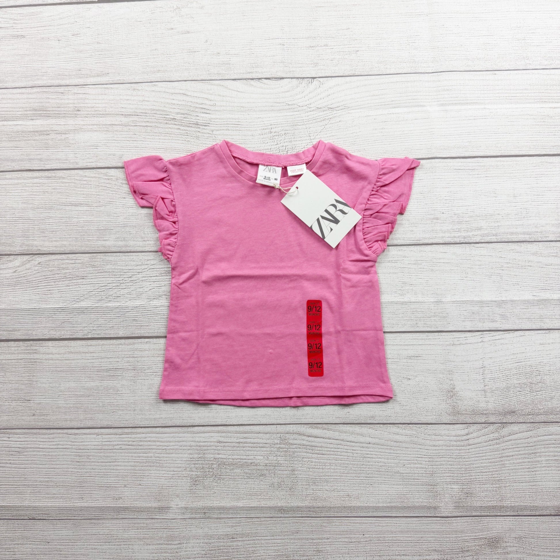 Zara baby girl short sleeve t-shirt in size 9-12 months. Soft pink fabric with delicate ruffle sleeves for a cute, feminine touch. Made from 100% cotton for comfort and breathability. New with tags.