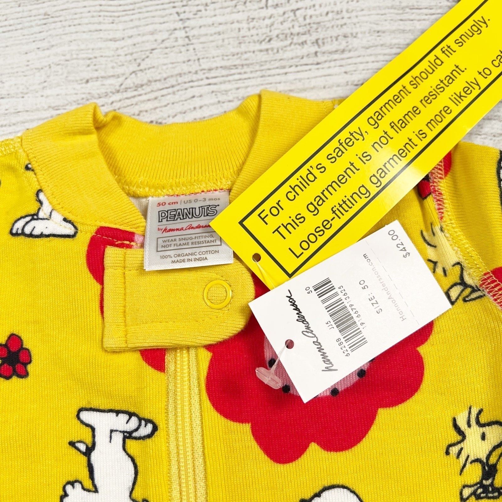 Yellow short sleeve and shorts one piece zip up sleep and play pajamas shortjams. Print includes floral flowers and Snoopy dog as well as Woodstock bird. Organic
