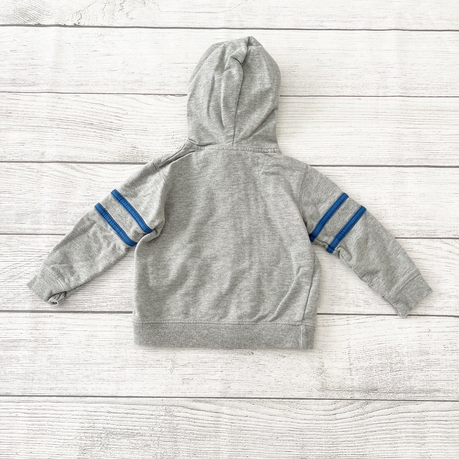 Grey gray long sleeve zip up hoodie hooded sweatshirt. Blue stripes on sleeves. Embroidered logo at chest. Pockets